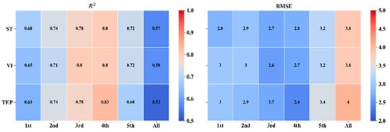 The ST, VIs, and TEP were established by the regression models for the prediction of LCC at different growth stages, which were validated using the validation datasets, and the results are shown in Figure 4. The R2 and RMSE of the validation datasets under different growth conditions and the R2 of the validation datasets were all greater than 0.50.
