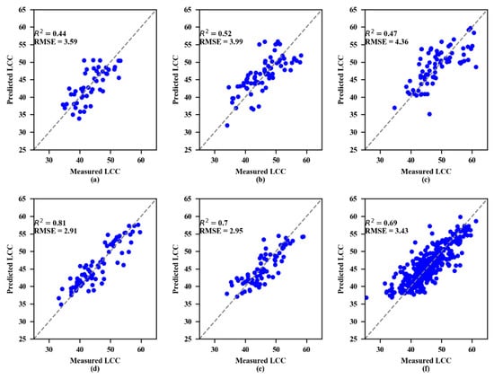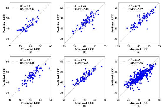 Measured and predicted LCC along the 1:1 line in the standalone validation dataset of the MLR models. (a) 1st growth stage, (b) 2nd growth stage, (c) 3rd growth stage, (d) 4th growth stage, (e) 5th growth stage, and (f) All growth stages.