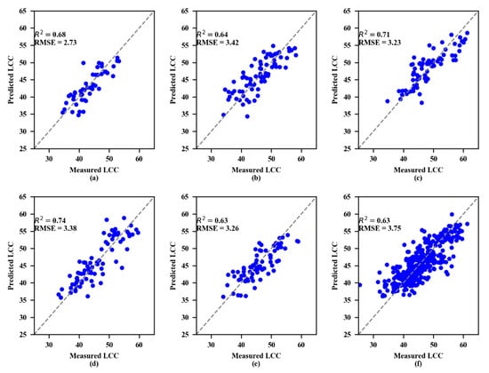 The parameters of the machine learning methods (SVR and RF) were optimized by the grid search method to obtain the best parameters and the calibration dataset coefficients R2 and RMSE, as shown in Table 7. Moreover, the R2 values of RF were higher than SVR for LCC estimation. For RF, the R2 values were all greater than or equal to 0.94. However, for SVR, the R2 values were rarely higher than 0.80, with the highest being approximately 0.82.