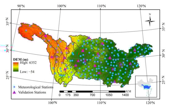 The Yangtze River Basin (YRB) was selected as the study area, which is the third largest river in the world (Figure 1). Covering an area about 1.8 million km2 which occupies nearly 18.8% of the extent of entire China mainland, YRB concentrates almost one third of the total population in China. Additionally, YRB also shows substantial spatial heterogeneity of land-cover types. With higher altitude in the upper region and lower altitudes in the midstream and downstream, the topography of YRB indicates a three-step ladder distribution, flowing through mountains, plateaus, basins, hills, and plains. To this point, the climate, meteorological and hydrological characteristics, and land covers in YRB are extremely complicated. Specifically, the distribution of annual precipitation is uneven, ranging from 500 mm in the west to 2500 mm in the east. The feature of temperature in YRB is formed under the influence of multiple factors such as solar radiation energy, East Asia atmospheric circulation, and the topography of Qinghai-Tibet Plateau. The annual mean temperature in YRB represents a trend of high temperatures in the east and low temperatures in the west. Due to the impact of different topography, the Sichuan Basin, Yunnan-Guizhou Plateau, and Jinsha River Valley have formed enclosed high and low temperature central areas. Over the last few decades, global warming has greatly influenced the hydrological cycle in YRB. For instance, Li et al. [39] investigated that the intensity and frequency of extreme rainfall event have increased significantly with the increase of temperature. Chen et al. [40] concluded that the occurrence frequency and severity of droughts under global warming of 1.5 °C and floods under global warming of 2 °C indicated an upward trend in YRB. To this point, an all-weather high resolution air temperature dataset is of great significance to understand the variation and underlying mechanism of the modified hydrological cycle and natural disasters in YRB under the changing environment.
