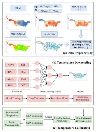 The methodology of temperature downscaling. The entire framework can be generally divided into three parts including (a) data preprocessing, (b) temperature downscaling, and (c) temperature calibration.