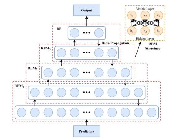 where means the parameters to be estimated. To be specific, represents the weight matrix while and denote the bias of visible neurons and hidden neurons, respectively. The training of DBN can be generally divided into two steps. First, the pre-training step starts from the input layer to the hidden layer of the last RBM network without supervision in order to study significant features from the independent variables. Then, the initialized parameters (i.e., weights and biases) will be further refined by the BP network to make the predicted values closer to the dependent variable.