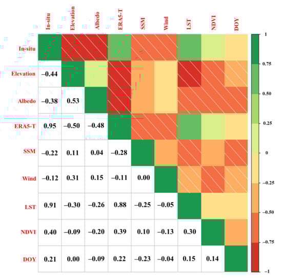 The correlation coefficient between air temperature and each predictor variables. The blue color represents positive relationship while the red color means negative relationship. The lower triangle of the figure represents the specific PCC values between two variables while the upper triangle uses colors and oblique lines to represent the positive or negative relationship.