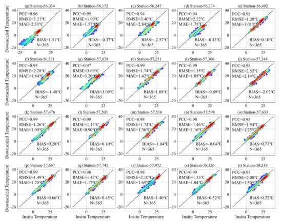 The scatter density plots and statistical metrics for 20 validation stations. The x and y axes represent in-situ ground measurements and downscaled temperature, respectively. The red color represents dense concentration of scatters. N means the number of observations for validation.