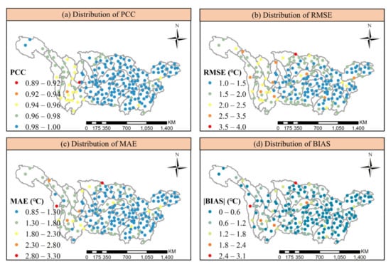 However, it can be observed that the distribution of density scatter points still varied from stations to stations. For instance, station 56,034 and 57,028 represented obvious overestimation against in-situ ground data while station 56,247 and 57,348 showed underestimation compared to in-situ observations. To further investigate the spatial patterns of the statistical metrics and downscaling accuracy in all meteorological stations, the distributions of four metrics are presented in Figure 6. Prominent spatial variations of these statistical metrics can be observed from the figure. For PCC, RMSE, and MAE, the stations located in the middle and lower region of YRB exhibited significantly higher accuracy (i.e., higher PCC values and lower RMSE and MAE) than that of upper reach. It may attribute to the complicated terrain in the west of YRB. The topography of upper region of YRB are mainly dominated by mountains and plateaus. And typical topographical areas include Qinghai-Tibet Plateau, Hengduan Mountains, Yunnan-Guizhou Plateau, and Sichuan Basin, which form a huge drop in elevation. Previous studies have found that the accuracy of some existing temperature products was relatively low in these areas, which was in line with the results of our study [30].
