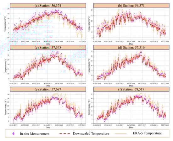 The temporal variations of the temperature data in 2019 at six randomly selected stations. The purple points represent in-situ ground measurements while the red dashed line and orange line indicate the downscaled temperature and ERA-5 temperature, respectively.