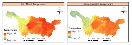 The spatial distributions of the temperature before and after GDA calibration are also presented in Figure 11. From Figure 11b, the residuals between downscaled temperature and ground observations ranged from −3 °C to 3 °C. Results indicated that overestimation of temperature mainly concentrated in the middle region of YRB while underestimation usually concentrated in the southwestern areas.