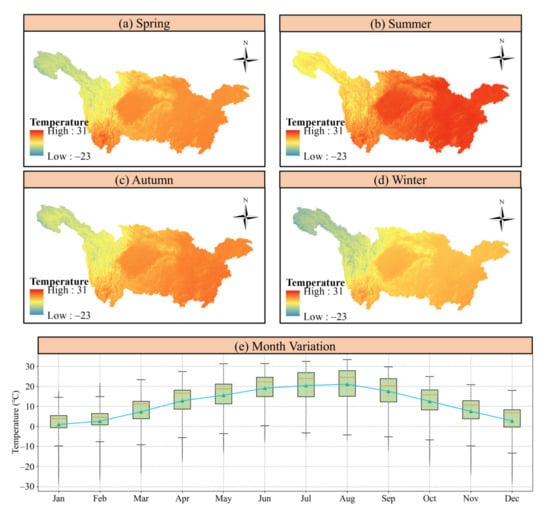 Moreover, we mapped the spatial distributions of average downscaled temperature in each season in 2019 (Figure 9). The spatial patterns of downscaled temperature showed prominent seasonality and spatial heterogeneity in YRB. The overall temperature ranged from −23 °C to 30 °C in 2019. Temporally, average temperature was significantly higher in summer (June to August) and lower in winter (December to February). Spatially, the downscaled temperature increased from the western YRB to the middle and lower regions of YRB. Location with lowest temperature lay in the Qinghai-Tibet Plateau, which had the highest elevation in the entire YRB.