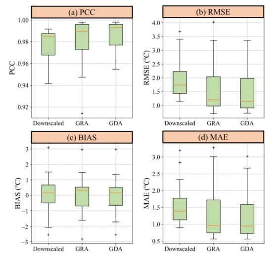 The box plots of the statistical metrics for 20 validation stations. Boxes from left to right in each subplot represent downscaled temperature, calibrated temperature by GRA, and calibrated temperature by GDA, respectively.