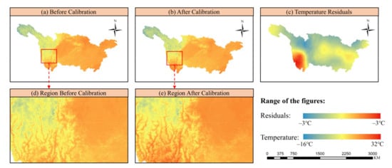 The spatial distribution of downscaled temperature before (a) and after (b) bias calibration. (c) is the distribution of residuals between downscaled temperature and in-situ observations. (d,e) are the regions with significant changes before and after calibration.
