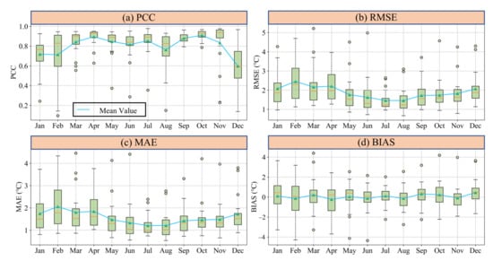 To investigate the performance of downscaling framework in different months, Figure 12 presents the variations of statistical metrics for all validation sites in month scale. The blue line indicates the mean value of corresponding metric. Generally, the variations of downscaling accuracy also represented distinct differences in different months. Specifically, downscaled temperature in spring (March to May) and autumn (September to November) showed lower errors rather than that in summer and winter. February and December witnessed relatively low downscaling accuracy with average PCC values of 0.69 and 0.60.
