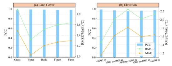 Model performance in different land cover types (grassland, farmland, forest, building, and water) and ranges of elevation (<1000 m, 1000~2000 m, 2000~3000 m, 3000~4000 m, >4000 m). The blue, orange, and green colors represent PCC, MAE, and RMSE, respectively.