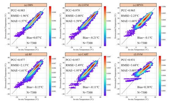 In the field of data fusion, spatial statistical methods (e.g., geographical weighted regression) and machine learning algorithms have been widely adopted to downscale and predict land surface variables. The commonly used machine learning approaches include random forest (RF), back-propagation neural network (BPNN), support vector machine (SVM), and gradient boosting decision tree (GBDT). With the rising of deep learning, researchers have also started to focus on the application of deep learning models in earth science studies [55]. For instance, Wu et al. [56] combined convolutional neural network (CNN) and long-short-term memory network (LSTM) to downscale high accuracy precipitation with a spatial resolution of 0.05°. Li et al. [57] developed a geo-intelligent deep belief network to map PM2.5 in China. In this study, we adopted deep learning model to downscale 1 km seamless and continuous temperature. To evaluate the role of deep learning in the downscaling framework, we also conducted to comparative experiments using other competing deep learning and machine learning algorithms, including long short-term memory network (LSTM), BPNN, RF, classification and regression trees (CART), and SVM. The automated machine learning (AutoML) technique was also adopted to help the construction of machine learning models, which has been widely used in various fields [58]. The effectiveness of these downscaling has been confirmed in various previous studies. The results of four statistical metrics averaging for 20 validation stations are shown in Figure 14. In general, all of these methods can achieve acceptable results in downscaling temperature. In comparison, three neural network models (i.e., DBN, LSTM, and BPNN) and RF outperformed CART and SVM with PCC values higher than 0.96 and RMSE lower than 2.25 °C. Among the first four algorithms, BPNN had poorest performance with PCC, RMSE, MAE of 0.965, 2.25 °C, and 1.68 °C, respectively. Random forest showed slightly better predictive power than BPNN. Generally, it can be observed that deep learning methods (i.e., DBN and LSTM) represented better capability than other machine learning models in downscaling temperature. The results indicated that DBN exhibited most powerful downscaling performance for obtaining the lowest errors (i.e., PCC, RMSE, MAE of 0.983, 1.96 °C, and 1.57 °C) against in-situ observations. It was largely attributed to the parameter initialization in the pre-training of RBM model, which overcomes the disadvantages of random initialization of traditional BPNN that may induce falling into the local optima and consuming long training time. The pre-training step can be regarded as the parameter initialization for a deep BPNN. Overall, the comparative analysis further confirmed the effectiveness of DBN in the proposed downscaling framework for producing high accuracy temperature data.