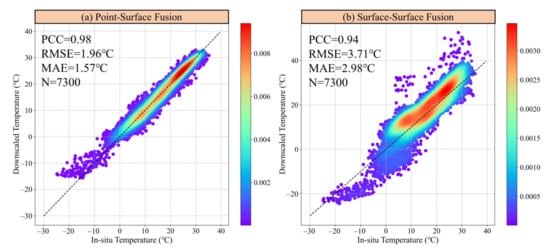 In this study, we applied point-surface data fusion in downscaling temperature since in-situ ground measurements are usually considered the most accurate compared to other data sources such as satellite-based and model-based products [59,60]. Some previous downscaling studies used remotely sensed or assimilated products as model outputs, which failed to take fully advantages of in-situ ground observations. In order to determine and evaluate the role of point-surface data fusion in improving the downscaling accuracy, we set a comparative experiment by applying a surface-surface fusion method in temperature downscaling. In this case, the output of the DBN model was ERA-5 temperature instead of in-situ measurements. The density scatter plots for 20 validation stations are presented in Figure 15. Compared to the downscaled temperature using model-based temperature as output, the accuracy of the downscaled temperature by adopting ground observations as output was substantially improved. The average PCC increased from 0.94 to 0.98 while the RMSE, MAE raised from 3.71 °C and 2.98 °C to 1.96 °C and 1.57 °C, which decreased about 47.17% and 47.32%, respectively. Although downscaled temperature in the case of surface-surface fusion still maintained high correlation with in-situ measurements, it is mostly attributed to the originally high correlation between ERA-5 temperature and ground observations. In a word, the application of point-surface data fusion was proved to enhance the overall performance of DBN model in generating 3H temperature.
