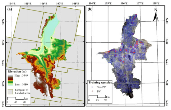 (a) The terrain of the Ningxia autonomous region; the gray bounds refer to the footprint of Landsat-8 sense used in this study. The path/row of the senses included 130/032, 130/033, 129/033, 131/034, 130/034, 129/034, 128/034, 130/035, 129/035, 128/035, 129/036, 128/036; (b) The true-color image from Landsat-8 over the Ningxia autonomous region and the training samples; the blue cross represents non- photovoltaic (PV) labeled points, while the red cross represents PV points.