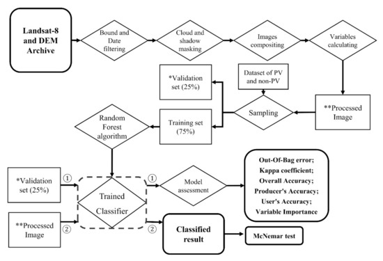 This study evaluated the random forest (RF) model’s performance and identified PV power plants on the Google Earth Engine (GEE) platform with Landsat-8 (L-8) imagery. The GEE platform can improve model calculation and data acquisition efficiency due to its cloud computing ability. The RF is an ensemble learning method that uses a set of decision trees for classification and regression tasks with advantages of high precision, efficiency, and stability [53]. The L-8 is a medium-resolution multispectral satellite that has the advantage of providing free images worldwide with spatial resolution at 30 m, a revisiting period of 16 days, and multispectral information simultaneously to map PV power plants.