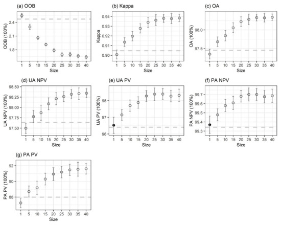 The mean value (dot) and stand deviation (error bar) of (a) Out-Of-Bag error (OOB), (b) Kappa coefficient, (c) Overall Accuracy (OA), (d) User’s Accuracy of non-PV power plants (UA NPV), (e) User’s Accuracy of PV power plants (UA PV), (f) Producer’s Accuracy of non-PV power plants (PA NPV), and (g) Producer’s Accuracy of PV power plants (PA PV) for the model trained with spectral variables and textural variables in different GLCM sizes. The dashed line was the mean value for the model trained with only spectral variables. The paired t-test was used to determine the difference between the model trained with only spectral variables and the model trained with spectral and textural variables; black and white points indicated statistically significant at p > 0.01 and p < 0.01 levels, respectively.