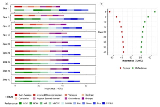 Variable importance in the Random Forest model to identify PV power plant trained with spectral variables and texture variables in different neighborhood sizes, (a) importance for each variable, (b) sum importance of variables from texture and spectrum.