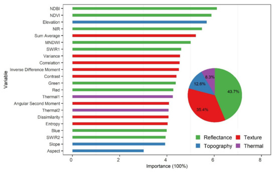 We separated the variables into four groups, which are reflectance spectra (G1), gray texture (G2), topography (G3), and thermal infrared spectra (G4). The variables from reflectance spectra include six bands and three calculated indices. The six bands were blue, green, red, near-infrared, and two shortwave infrared bands. The three indices were the Normalized Difference Vegetation Index (NDVI) [73], the Normalized Difference Built-up Index (NDBI) [74], and the Modified Normalized Difference Water Index (MNDWI) [75] (Table 1). The NDVI, NDBI, and MNDWI are sensitive to variations of vegetation, water, and buildings, respectively, and are commonly used in the RF model as variables to classify land cover types [76,77,78].