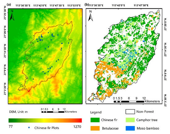 Chinese fir plantation is distributed in the north, east and south of the study area. A total of 50 plots of Chinese fir were measured by field investigation using a random stratification sampling from 2016 to 2017. Due to the scarcity and inaccessibility of woodlands above 800 m, all the selected plots are below 800 m (Figure 2a). The plots are 20 m × 20 m or 30 m × 30 m large, depending on the topographic features and tree stand density (Figure A1a). The Zenith15A real-time kinematic (RTK) system was used to receive the signals from Hunan Satellite Navigation and Positioning Public Service Platform (HNCORS) and work together with the total station ZT20 to accurately measure the positions of the four corner points of the sample plot to determine the plot boundary (Figure A1b,c). In each plot, the information of all standing living trees with the diameter at breast height (DBH) no smaller than 5 cm were measured and recorded, including tree DBH, height, and topographic factors (e.g., slope, aspect). As shown in Table 1, the tree AGB value can be obtained by DBH and tree height [58]. The values of the AGB measurements at all plots are shown in Table 2.