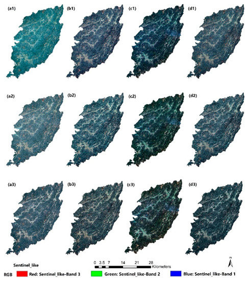 In this study, four classic pixel-level fusion algorithms (GS, NND, WRM, and BT) are used to fuse three GF-2 multispectral images with Sentinel-2 images. Compared with the original Sentinel-2 image (Figure A3), all Sentinel-like RGB true color images (Figure 4) have enhanced clarity. Specifically, the GS and NND fusion images (Figure 4(a1–a3,b1–b3)) have more obvious texture details, better clarity. The overall tone of the WRM fusion images (Figure 4(c1–c3)) is natural, close to Sentinel-2 image, indicating high spectral retention. However, these images have no obvious texture details and have a lot of noise and outliers. The BT fusion images (Figure 4(d1–d3)) have more obvious texture details, but lower tone and larger spectral distortion than the original Sentinel-2 image.