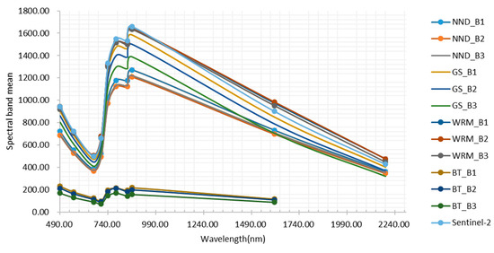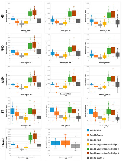 As shown in Figure 5, Band 8 (Vegetation Red Edge 4) of all the Sentinel-like images except Figure 5j–l) has the largest spectral value. The spectral value ranges of Band1–3 are narrow, but others are wide, which is highly consistent with the Sentinel-2 image (Figure 5m). Unlike the original GF-2 image whose spectral value peaks in Band2 (Green), Sentinel-2 and all Sentinel-like images have a higher spectral pixel values in the blue band than in the red band, which may be due to the low resolution of Sentinel-2, small crown width, needle-shaped leaves, and large gaps in the Chinese fir woodland. The spectral dispersion of the GS and NND fusion images in the visible light and vegetation red edge bands is better than that of the original Sentinel-2, especially that in Figure 5b,c,f. The spectral distribution of WRM fusion image Figure 5g–i is basically the same as that of Sentinel-2 image. For the BT fusion image Figure 5j–l, the spectral distribution ranges of visible light and vegetation red band are very close. As Figure 6 shows, almost all Sentinel-like spectral curves are similar to Sentinel-2, except for the BT fusion images. BT is a simple fusion method that decomposes multi-spectral image pixels into colors and brightness, and then multiplies them with high-resolution images. It can only fuse 3 multi-spectral images at a time. This may be the reason of the distortion in the fusion image Figure 5j–l. Yang et al. [64] compared the GS, NND and WRM fusion methods, and found that the change trend of the spectral curve of the images fused by three methods are basically the same as that of the original images, but the WRM fusion image retains much more spectral information than other images. This result is consistent with our research.