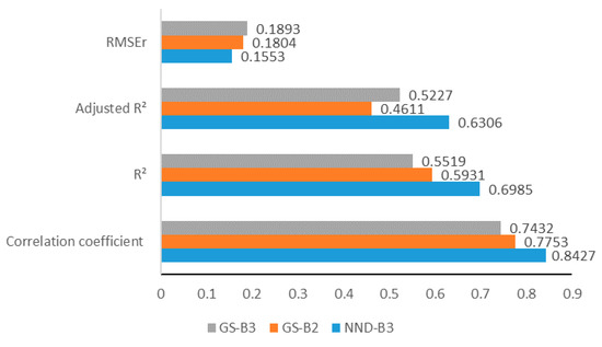 The NND_B3 obtained by fusing the red band of GF-2 with Sentinel-2 by the NND method has the advantages of both GF-2 and Sentinel-2. GF-2 and Sentinel-2 have similar AGB estimation performance in F1 feature sets. However, for feature sets F2 and F3, the RMSEr of NND_B3, GF-2 and Sentinel-2 are different (Table A1). For the F2 feature set, the optimal RMSEr of Sentinel-2 is 0.0288 larger and R2 is 0.1704 smaller than that of NND_B3. For the F3 feature set, the optimal RMSEr of NND_B3 is lower than Sentinel-2 by 0.0515, and R2 is larger by 0.2343. Using NND_B3, the estimation accuracy is greatly improved. As the scatter plot of Figure A5 shows, NND_B3 has more concentrated distribution, clearer fitting trend, and higher correlation coefficient r than other data. We also compared the estimation accuracy of using GS_B2 (RMSEr, 0.1804) and GS_B3 (RMSEr, 0.1893) and found their accuracy is lower than using NND_B3(RMSEr, 0.1553) (Figure 7).
