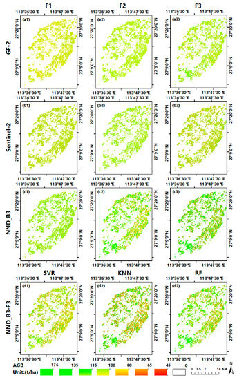 The AGB estimation results of the 4 regression algorithms using the optimal feature combination are shown in Table A1. The KNN-based and RFR-based methods are used in all data scenarios, but only the better results are shown in Table A1. For comparison, three data sources, GF-2, Sentinel-2, and NND_B3, are used to estimate the forest AGB.