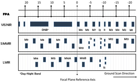 VIIRS FPAs: VIS/NIR, S/ MWIR, and LWIR. The VIIRS band layout is in the scan direction. The M- and I-bands have 16 and 32 detectors in the track direction, respectively. Values at the top of the figure represent each band’s position in M-band sampling interval units relative to the focal plane reference axis. These values also define the relative number of samples removed at the EV beginning-of-scan for alignment. The Day-Night Band illustrates four detector arrays in three gain stages and is not to scale.