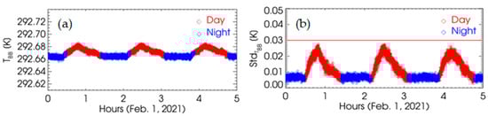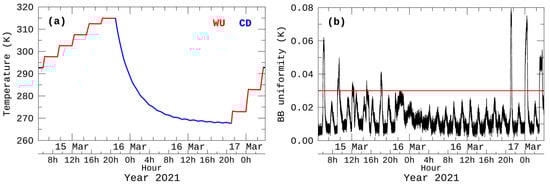S-NPP VIIRS BB (a) temperature and (b) uniformity with requirement (red line) throughout an entire WUCD operation from 15 March to 17 March 2021.