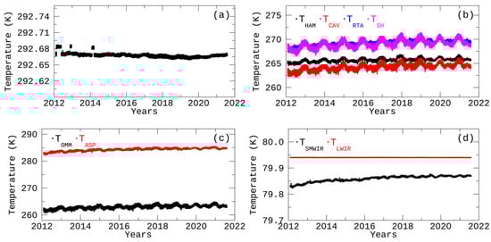 Also used in the thermal model and to inform about the instrument’s health, Figure 4b–d displays the mission-long time series of the other crucial telemetry points (such as the cold FPAs temperatures). The non-BB temperatures used in the thermal model are shown in Figure 4b. All temperatures show yearly variations no larger than 3 K; the local maximums correspond to the Earth at perihelion, while some other out-of-behavior values are due to single board computer lock-up/petulant mode events. The electronics and instrument temperatures, shown in Figure 4c, exhibited an increase of about 2.5 K over a decade. Figure 4d displays the cold FPAs temperatures. The LWIR FPA temperature has been rather stable (79.94 K) since it reached its operational temperature. The S/MWIR FPA temperature has risen approximately 40 mK (from ~79.83 K to ~79.87 K) over 10 years. Because the S/MWIR FPA temperature is passively controlled, as opposed to the LWIR FPA temperature, it shows more fluctuation [4]. Under nominal operation conditions, the impact due to such temperature variations on the calibrated L1B product is minimal, since the TEB calibration is updated on a scan-by-scan basis by referencing detector responses to the onboard BB.