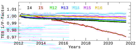 As presented in Section 3.1, the VIIRS TEB calibration uses a quadratic algorithm, and the detector gain (1/F-factor) is computed on a scan-by-scan basis using its response to the BB radiance. Using Equation (3), the TEB F-factors during nominal operations were calculated (data collected from two granules during every orbit’s solar observation). Afterwards, the TEB gains were trended over on-orbit operations. Figure 6 shows the band-averaged results. All results shown henceforth are for HAM-side A only to avoid redundancy and prevent all figures from being overcrowded, since the HAM-side B results are essentially similar. All values are normalized to 20 January 2012. The degradations of the S-NPP VIIRS TEB have generally been small after a decade on-orbit. Band I5 exhibits the most degradation (around 3.1%), while the other LWIR bands show degradations no larger than 0.3%. Moreover, while bands M15 and M16 cover the same spectra as I5, these do not share the same level of degradation; this is possibly due to different electronics and sampling. All the LWIR bands display an annual cycle wherein local minimums are seen whenever the Earth is at perihelion. Moreover, a small jump early in the mission (mostly noticeable for the LWIR bands) can be attributed to a different BB temperature setting during a short period. These annual gain sequences are correlated to those in the temperatures used in the instrument thermal calibration model; though, since these temperatures are highly interrelated, it is difficult to pinpoint any specific telemetry temperature. All changes in the S-NPP MWIR detector responsivities are smaller than 1% after 10 years of sensor operations. Moreover, the MWIR bands had a minor gain decrease during early mission, it has since flattened. Additional discontinuities can be attributed to single board lock-up/petulant mode events and early mission instrument and spacecraft anomalies (see Table 2).