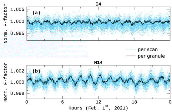 In the interest of evaluating the on-orbit short-term performance at the detector level, Figure 7 illustrates the bands I4 (detector 16, Product Order) and M14 (detector 8, Product Order) scan-by-scan and granule-averaged F-factors for one day’s worth of data (1 February 2021). The F-factors were normalized to the first data point of the day and are only shown for HAM-side A. These two bands were selected to represent both cold FPAs and band types. Minor orbital variations (~0.1% and ~0.2% (or smaller) on a granule-averaged and scan-by-scan basis, respectively) can be observed for all TEB; all partially attributable to BB temperature variations throughout every orbit [13].