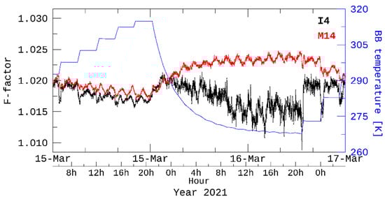 S-NPP VIIRS bands I4 (detector 16, Product Order) and M14 (detector 8, Product Order) F-factors and BB temperature during WUCD event performed from 15 March to 17 March 2021. Values shown are granule-averaged. Only the F-factors for HAM-side A are illustrated. The M14 F-factors were shifted upward by 2.75% so that these can be in the same range as the I4 F-factors.