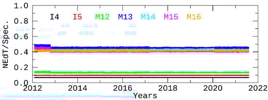 As mentioned in Section 3.3, the noise performance for each TEB detector is characterized using the NEdT during nominal operating temperatures (~292.7 K) as well as the NEdT at Ttyp-derived using measurements from periodic BB WUCD operations. Figure 9 shows the band-averaged normalized NEdT trends (HAM-side A only) during nominal operations for all the S-NPP VIIRS TEB. These trends were plotted with the same granules used for Figure 6. All data points are normalized to the NEdT specification for each band. It can be observed that all TEB are well within the specification for the entirety of the mission. Bands M13, M15, and M16 are at about the halfway mark (~0.40–0.50) from their respective NEdT specifications, while bands I4, I5, and M12 have NEdT values no higher than 15% of their specification. Overall, the noise performance for all bands is quite stable. As discussed previously in Section 3.1, the small jump during early mission can be attributed to a different BB temperature setting. It should be noted that detector 2 in band I5, detector 16 in band M12, and detector 9 in band M16A (all in Product Order) have shown higher NEdT, albeit well within the specification, than other detectors in their respective bands and have been consistently like this throughout the mission. However, while well within their respective requirements, some of the stripe noise from these three bands propagates from the L1B clear-sky BT onto the Level 2 Sea Surface Temperature (SST) products. This striping has been shown to cause up to a 0.2 K SST difference in some cases [17]. Bouali and Ignatov [17] proposed an empirical destriping approach and demonstrated it to be feasible over ocean scenes via quantitative and qualitative analyses using an S-NPP VIIRS 3-day global dataset. Table 4 summarizes the band-averaged NEdT at Ttyp-derived from BB CD data for all S-NPP VIIRS TEB. The NEdT values are provided for three different years (2012, 2016, and 2021) in the sensor’s mission. It also includes the prelaunch NEdT values as well as the NEdT requirement for each band. Similar to the results during nominal operations, the NEdT values for all bands are well within their specification at Ttyp. Moreover, all bands exhibit on-orbit NEdT slightly lower than their prelaunch-derived noise characterization. Lastly, the NEdT at Ttyp for the three years selected demonstrates that the noise performance has been quite stable over the instrument’s mission as well.