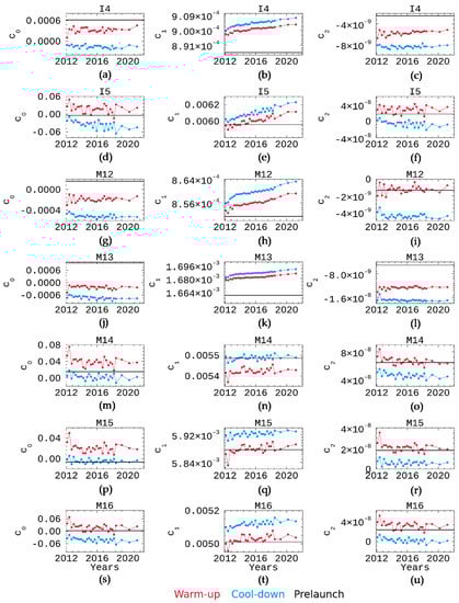 As briefly discussed in Section 3.2, the data from the WUCD operation provide a calibration radiance foundation over a broad 50 K temperature range that is independent from the prelaunch calibration source. Moreover, band, HAM-side, and detector-dependent 2nd order polynomial calibration coefficients (, , and ) can be derived using Equation (5). These WUCD-derived coefficients can be used to describe the VIIRS TEB on-orbit calibration nonlinearity over time. Furthermore, and as discussed previously, these can be utilized to lessen calibration biases during the WUCD cycle [14].