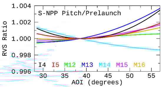 A spacecraft deep space pitch maneuver is a designated postlaunch activity for RVS characterization. The S-NPP VIIRS pitch maneuver was designed and performed to validate its prelaunch TEB RVS characterization. It was completed on 20 February 2012 as part of the VIIRS rigorous calibration and validation stage to provide data for the on-orbit characterization of the TEB RVS [18]. In this maneuver, the spacecraft rotates around its y-axis and VIIRS gets a clear deep space view for a quarter of an orbit. When observing the deep space, the radiance perceived by the detectors comes from the sensor components’ thermal emissions (including the HAM; whose emission varies with scan angle), while the EV external radiance is fundamentally zero. As such, the emissive radiation’s relative change across the EV scan range (proportional to the change in detector’s relative responses) can be examined to determine the TEB RVS. Data used for the TEB RVS characterization include the deep space and OBC BB detector responses. Furthermore, there is an underlying assumption that there are no polarization effects. This would impede HAM self-emission with scan angle variations from being effortlessly translated to RVS. During the prelaunch RVS derivation, an external unpolarized source was used to estimate the RVS [19]. Figure 11 illustrates the results published by Wu et al. [18,20]. These demonstrate good agreement between the on-orbit pitch maneuver-based and prelaunch RVS values—within 0.4% (close to the 0.3% requirement, and only exceeded by bands I4 and M13 at the edge-of-scan angles). It was inferred then that any HAM emission polarization effects are insignificant, and thus the RVS prelaunch characterization is valid.