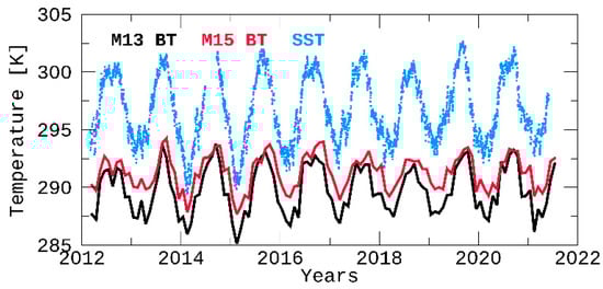 Figure 12 shows the S-NPP VIIRS bands M13 and M15 BT and in situ SST over the ocean buoy site near the Hawaii Islands. These two bands were selected to represent one band from each cold FPA and because their Ttyp are quite close to the average SST (see Table 1). The VIIRS and buoy temperatures are collocated in space and coincident in time. The brightness temperatures for the VIIRS bands were plotted as monthly averages. The in situ SST shown are nighttime observations only. All time series start on 20 January 2012. Data gaps in the SST observations are due to outages. It can be observed that both VIIRS bands exhibit similar temperatures in terms of magnitude and seasonal oscillations. Moreover, while there is an offset between the SST and VIIRS BT, it seems apparent that their overall trends are quite similar. This offset can be attributed to slight differences between the BT perceived by the VIIRS infrared channels and the water depth of the temperature sensors. To confirm this, Table 5 shows the VIIRS-buoy yearly change rates for each TEB over the sensor’s mission. A detailed description and more thorough analyses of the results presented next is discussed by Pérez Díaz and Xiong [22]. Results indicate that all TEB display excellent on-orbit performance through vicarious calibration. All bands exhibit change rates within 0.02 K/y. Band M13 shows the largest temperature trend when compared to the buoy data with a total drift of 0.19 K after a decade in orbit. It is followed by band M12 with a downward drift of 0.13 K over 10 years of operations. These results demonstrate that the S-NPP VIIRS TEB continue to be well-calibrated throughout the mission at typical temperature scenes. In Section 4.5.2, the S-NPP VIIRS TEB on-orbit performance will be evaluated over a broader temperature range using an inter-sensor comparison.