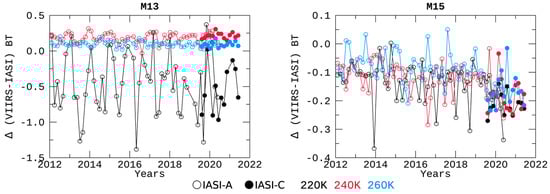S-NPP VIIRS-IASI BT difference (ΔBT) time series for bands M13 and M15 at IASI-simulated M15 BT centered at 220 K, 240 K, and 260 K (described by different colors) with bin sizes of ±5 K. Empty symbols define IASI-A, while filled symbols represent IASI-C. Brightness temperature units are in Kelvin.