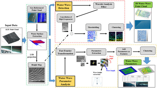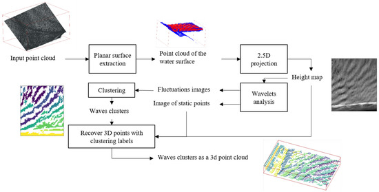 Few efforts used 3D LiDAR point clouds for ocean water wave detection and analysis. Our proposed method was done on large-scale 3D LiDAR point cloud dataset. Our method can adapt to different types of oceanic, river, and wetlands water wave shape. Figure 2 represents the flowchart of our method. The main contributions of this paper are summarized as follows: