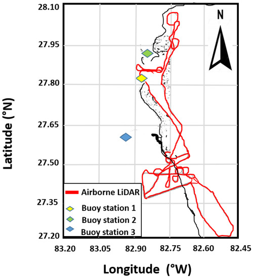 The sea surface is measured by directional floating buoys and the processed data is available every 30 min. In this study, three buoy stations observe the water level around the study area (station 1 ‘Clearwater Beach, FL’, station 2 ‘Fred Howard Park, FL’, and station 3 ‘Egmont Channel Entrance, FL’) along with wind speed, air temperate, significant wave height, and wind direction, Figure 4. However, station 1 and 2 did not record any wave height data during flight missions in 2015. Therefore, there is missing wave height data. The only available wave height data belongs to station 3, which was far (around 40 km) and the average wave height in station 3 is between 0.4 m and 0.7 m in 15 October 2015. This correctly confirms the algorithm output. Moreover, this new observation with ALB compensates for the missed data and shows the high capabilities of Airborne LiDAR when in situ measurement data is missed.