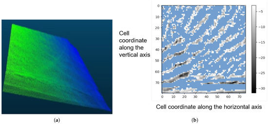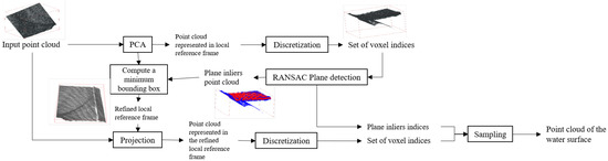 We extract the water surface jointly with a coordinate system (local reference frame) in which the maximum and minimum 3D points draw a minimum volume bounding box around the water surface inliers. In this regard, first, we extract 3 principal components using Principal Component Analysis (PCA). The component with the lowest variance approximates the water surface’s normal vector since the point cloud is extended horizontally. Then, to separate the water from under-water surface, we conduct a discretization of the point cloud that acts like a standardization method. In summary, we divide the range of coordinates values in each axis to intervals. Each interval is then indexed from 0 to . Afterwards, the 3D space is partitioned into a set of 3D boxes, or voxels, where each box is referred by 3 bins indices. Every 3D point is then replaced by the coordinates of the box where it belongs. We then use a linear regression coupled with an outlier detector as Random Sample Consensus (RANSAC) [45] to find the planar surface with maximum inliers along with the inlier’s indices (a list of indices from 1 to ). Subsequently, the inliers are then used exclusively to re-estimate the local reference frame using PCA followed by an estimation of the minimum bounding box of the planar surface. The axes of the bounding box form the refined local reference frame. We finally project the input point cloud onto the refined coordinates system, select planar surface inliers, and discretize them to voxel indices. In Figure 8, the results of voxel indices set will be used for the 2.5D projection.