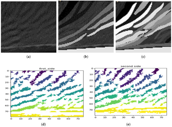 (a) Orthoimage. (b,c) are annotated versions of the projection of the point cloud as an orthoimage. (d,e) shows the positive and negative wave detection.