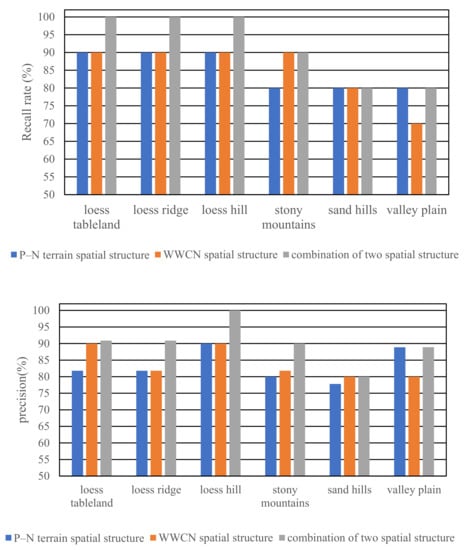 To comprehensively compare the performances between these three classification methods, Figure 11 shows the recall rate and precision of these three classification results. As can be seen in Figure 11, most of the recall rates and precision are beyond 80%, which suggests the good performance of these two landform recognition methods. These indicated that by depicting the terrain spatial structure of the landform from different angles, the WWCN spatial structure and the P–N terrain spatial structure are feasible for the classification of landforms. The accuracy and recall rate of the P–N terrain spatial structure is generally lower than that based on the WWCN spatial structure. Moreover, for the WWCN spatial structure, the overall accuracy is 85% and the kappa coefficient is 0.82; for the P–N terrain spatial structure, the overall accuracy is 83.333% and the kappa coefficient is 0.80066. Thus, for the single quantitative description of the watershed spatial structure, the WWCN spatial structure exhibited a better identification effect than the P–N terrain spatial structure.