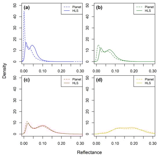 Density plots of Planet (dashed lines) compared to corresponding Harmonized Landsat Sentinel-2 (HLS) (solid lines) for (a) blue, (b) green, (c) red, and (d) nir bands. Data were derived from a scene captured on 8 October 2020 in western Colorado, USA [38.88N, −107.05W].
