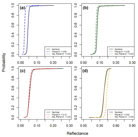 where is the transformed PS reflectance, is the original PS reflectance, and and are multiplicative and additive constants that can be determined through substituting with the reflectance value of a co-located, reference standard pixel (e.g., Sentinel or Landsat). Linear scaling will shift PS reflectances to match a reference standard, such as in Figure 4, which shows cumulative density functions and Kolmogorov–Smirnov D-statistics comparing the distributions. In all four bands, the linear transformation changed the D-value considerably, shifting the distribution of the PS data to align more closely with the Sentinel data (Figure 4). Regardless of the difference between the untransformed values (coarser dash) and the Sentinel distribution (solid line), the adjusted PS distribution (finer dash) is nearly coincident with the Sentinel distribution in all cases, indicating that the linear transformation was successful in matching the distributions. However, it should be noted that these adjustments are relative corrections that normalize the imagery [29], they do not necessarily correct the absolute radiometric quality of the imagery.