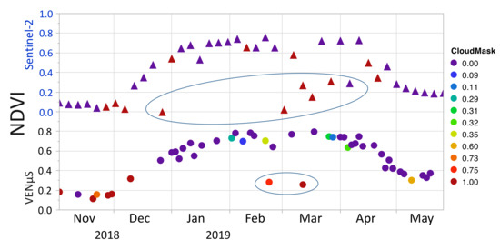 NDVI phenology of a field, as retrieved by VENµS and Sentinel-2. CloudMask data are for the whole tile.