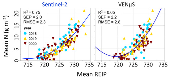 Reference fertilization strips are based on a lower or higher level of base/to- applied nitrogen. Where the lower N level has a significant effect, the N deficiency symptom should be shown by a decrease in biomass production and/or reduce N content in wheat dry matter. Conversely, significant superfluous N levels should be shown by an increase in biomass production and/or increase N content in wheat dry matter. In both cases, wheat above ground N uptake (biomass multiplied by N concentration) represent the real situation and can be best estimated by REIP (Figure 5). Therefore, the REIP GEE algorithm is suggested for N reference strip estimations. The satellite-based correlations were in some cases lower than proximal sensing data. Nevertheless, Figure 5 shows that the correlations of the N uptake estimations are high enough to be used (with the S2 L1 REIP) for making decisions based on reference strips. This is in agreement with the use of red-edge-based VIs for reference strip or nitrogen uptake in wheat, rice, and corn [22,51,57,58].