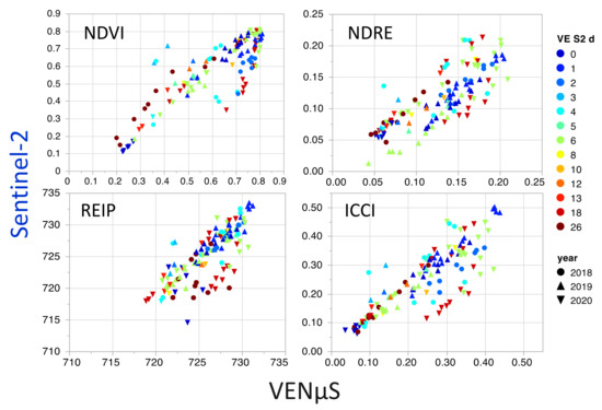 The correlations for the averaged (per field*day) samples were higher than those for the individual sampling points for both VENµS and Sentinel-2. REIP, ICCI, and NDRE exhibit a high correlation with the biophysical variables. For these parameters, the VENµS higher resolution (5 m pixel) does not exhibit significant improvement over Sentinel-2. The correlations with canopy N concentration were low for most indices. The correlations were much higher for canopy N content, similar to those for biomass, as was also observed over rice [50]. The correlations were highest for REIP, r = 0.81 (VENµS) and 0.87 (Sentinel-2), and steady along the three growing seasons (Figure 5). VENµS VI’s values were in high correlation with Sentinel-2 VI’s (Figure 6), although several sampling fields/dates can be considered outliers probably because of abnormal atmospheric conditions.