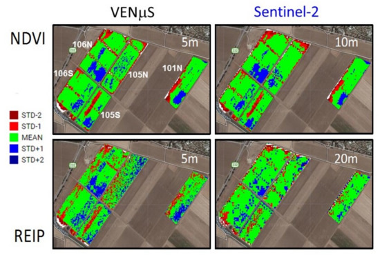 Figure 7 shows VENµS and Sentinel-2 NDVI and REIP anomalies for five fields in Saad on 15 January 2019, as seen in the GEE anomaly app. The NDVI within field patterns for VENµS and Sentinel-2 were similar. VENµS-based REIP exhibited much more variation than Sentinel-2, probably due to the coarser spatial resolution of Sentinel-2.